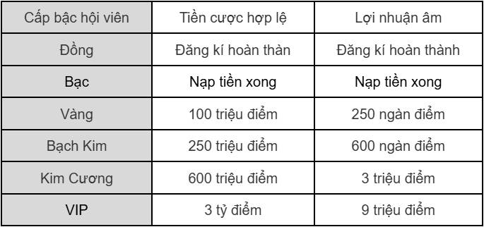1. Khi đạt mức cược hợp lệ hoặc lợi nhuận âm tương ứng với cấp bậc, ngày 1 tháng sau sẽ được lên cấp.